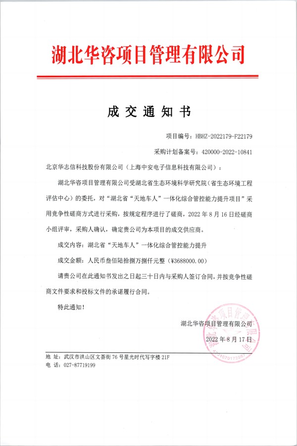 中安科技中標湖北生態環科學院“湖北省‘天地車人’一體化綜合管控提升”項目(2022/10/10)
